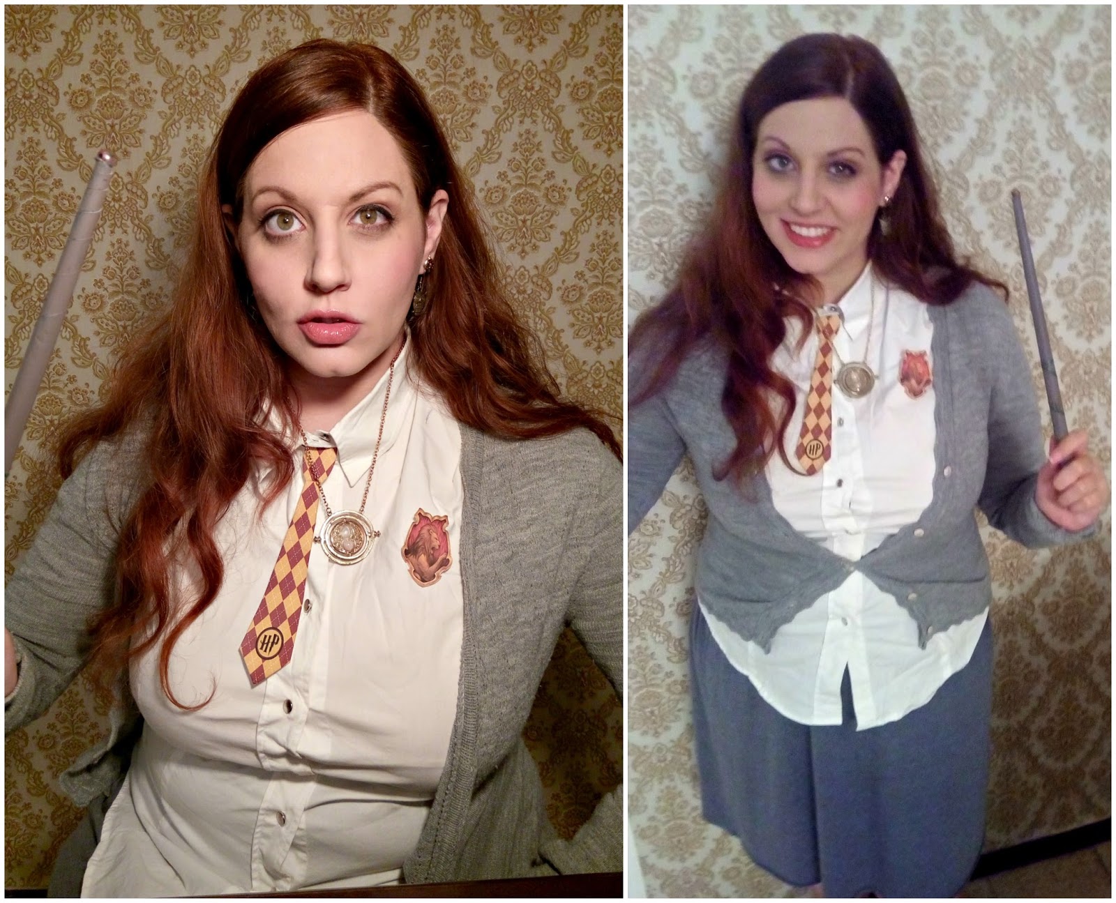 את הסיכה, העניבה, והשרביט, כבר היו לי ממסיבת ההארי פוטר שלי, ושיער ג'ינג'י טרי שגרם לי להרגיש כמו ג'יני וויזלי... כל מה שהיה צריך להוסיף זה חולצה לבנה מחוייטת (תתפלאו כמה קשה למצוא כזאת במלתחה שלי), קרדיגן אפור פשוט (כל גוון של אפור, או אפילו כחול כהה או שחור יעבדו), וחצאית אפורה (הבד שלה לא נכון - טריקו רך, אבל היא עובדת גם ככה). כמובן שלא התאפקתי והשתמשתי גם בשרשרת מחולל הזמן של הרמיוני... ולא ממש רואים בתמונה אבל יש לי ינשופים גאים מתנדנדים מהאוזניים. אם הייתי הולכת עם הרמיוני אז הייתי מתלתלת את השיער, או עם לונה - הייתי בוחרת בסיכה ועניבה של רייבנקלו (ועגילי סלק). זו תחפושת פשוטה שעם שינויים קלים יכולה להתאים לכמעט כל תלמיד הוגוורטס - וכמובן, תמיד תוכלו להיות "ניצב מספר 6".